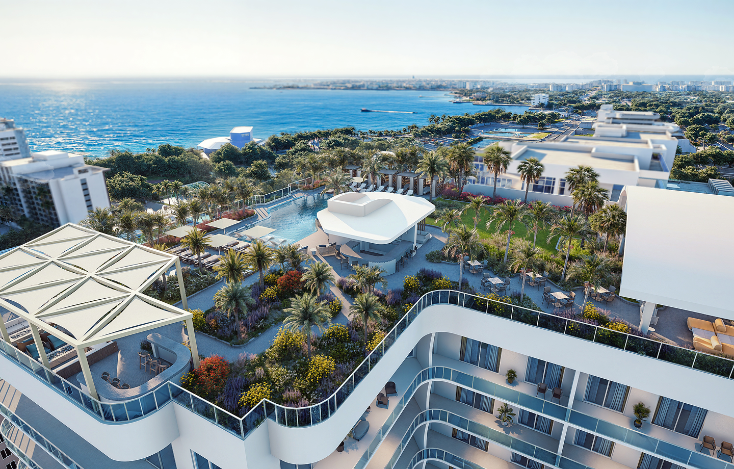 Residents can enjoy the glimpses of Sarasota Bay’s turquoise waters, the park’s vibrant community energy, and downtown’s lively culture, all from a serene, elevated perspective.